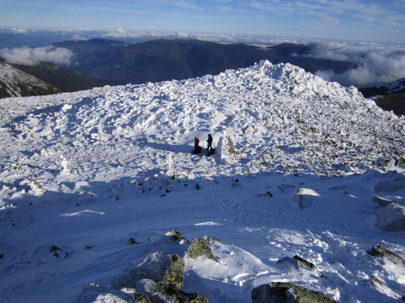 Blue and Mr. Blue in the lee of the big cairn while I'm on the summit -- Note that their position relative to the cairn and the rime on the cairn shows that the wind is coming from an unusual direction.