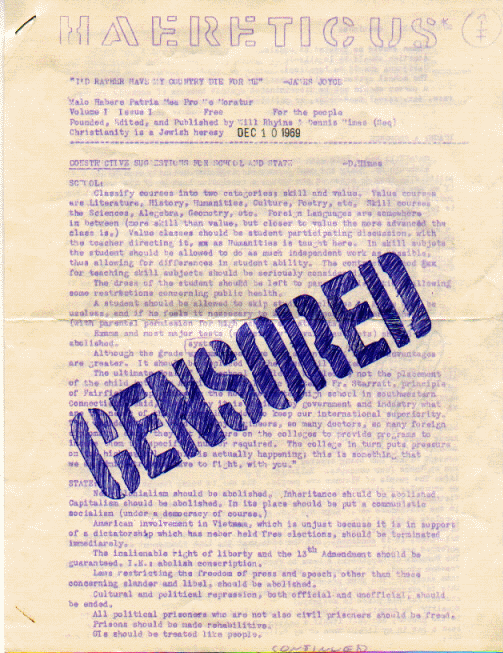 In the fall semester of 1969 I was a sophomore at Ridgefield High School in Ridgefield, Connecticut. I had attended Woodstock that summer, and, like many people those days, was filled with the excitment of believing that I was living at the beginning of fundamental changes in the culture of the country, if not the world. Of course, we now know that the changes to come were to be much less fundamental than we'd thought, but at the time the term counterculture was taken seriously. One aspect of that counterculture was the underground newspaper. Underground papers were a way for people without wealth or connections to communicate their ideas beyond their immediate circles of friends, a function now provided by the Internet. All you needed was access to a mimeograph machine. I had that. I don't remember the details, but I got permission to use the mimeograph machine at St. Mary's School, which I had attended in fourth through seventh grade, and at which I still attended religious ed. classes. I and my friend Will Rhyins, whom I had known at St. Mary's, published an underground paper named The Heretic. I wrote it; Will and I published and distributed it.